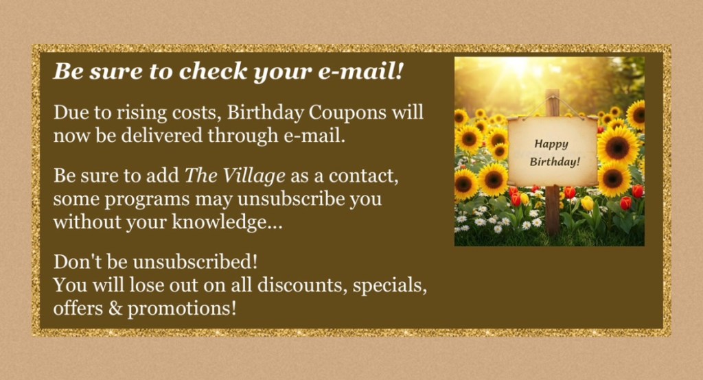 Join our email/newsletter list by sending your information to: thevillage89406@hotmail.com